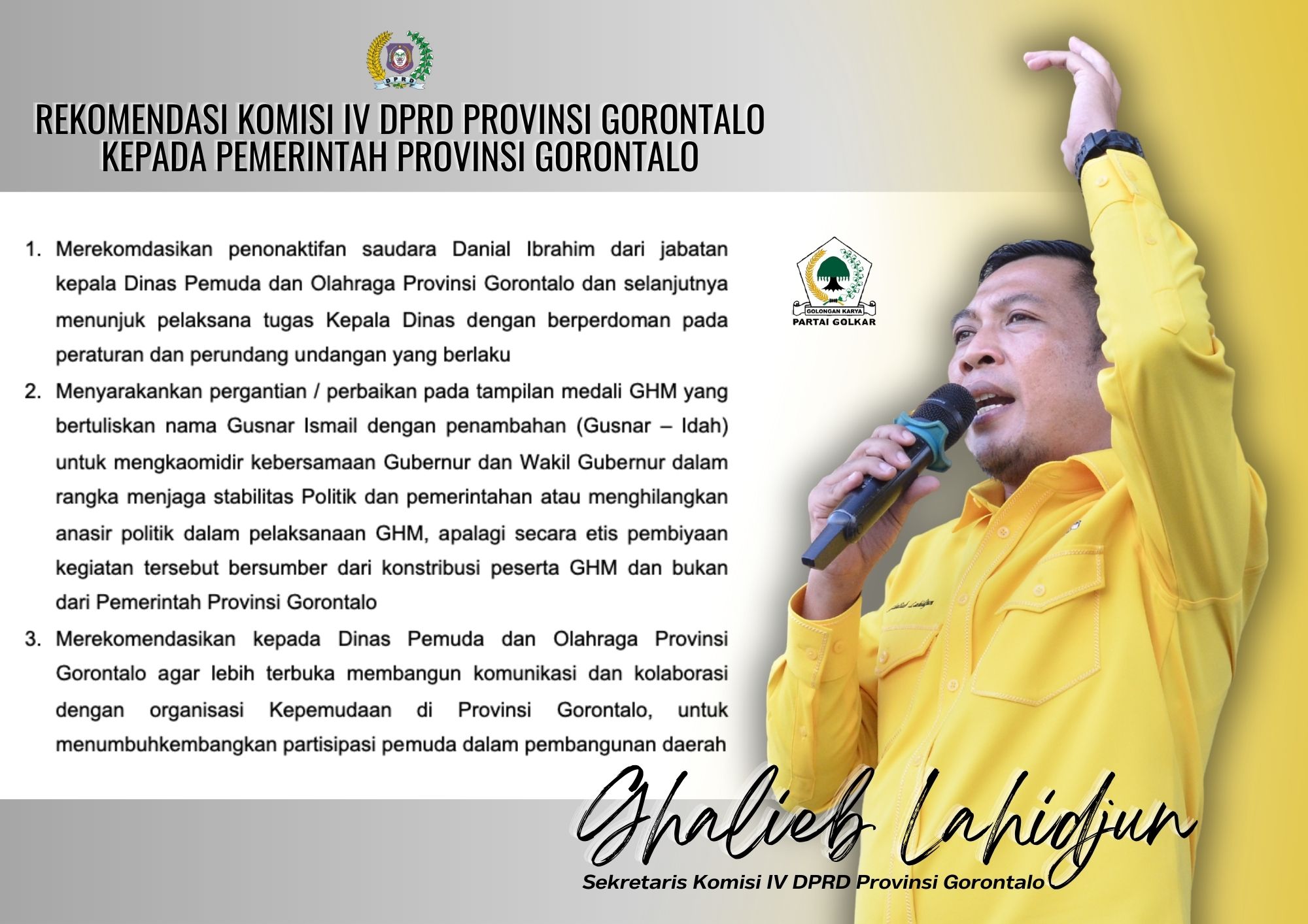 Lanjut Ghalieb Lahidjun yang juga Aleg dari Fraksi Partai Golkar DPRD Provinsi Gorontalo itu tegaskan, tiga rekomendasi Komisi IV untuk Pemerintah Provinsi Gorontalo pertama menonaktifkan Danial Ibrahim dari jabatan Kepala Dinas Pemuda dan Olahraga Provinsi Gorontalo.