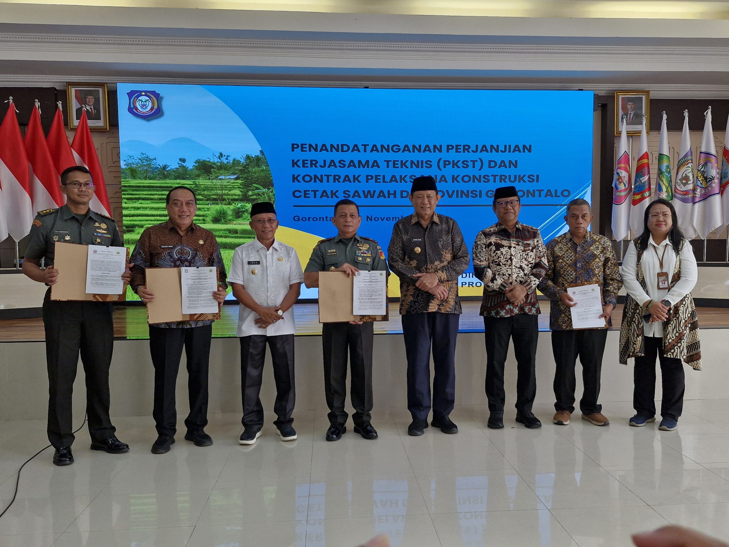 HABARI.ID, PEMPROV | Program percetakan sawah baru di Provinsi Gorontalo, segera dimulai. Ini ditandai dengan penandatanganan PKST dan kontrak konstruksi, Jumat (28/11/2025). Yang disaksikan langsung Gubernur Gusnar Ismail, Danrem 133/NWB, Pemkab Pohuwato dan pihak Kementrian Pertanian. Pada tahap awal, seluas 1.000 hektar akan mulai dikerjakan dari total target 5.642 hektar.