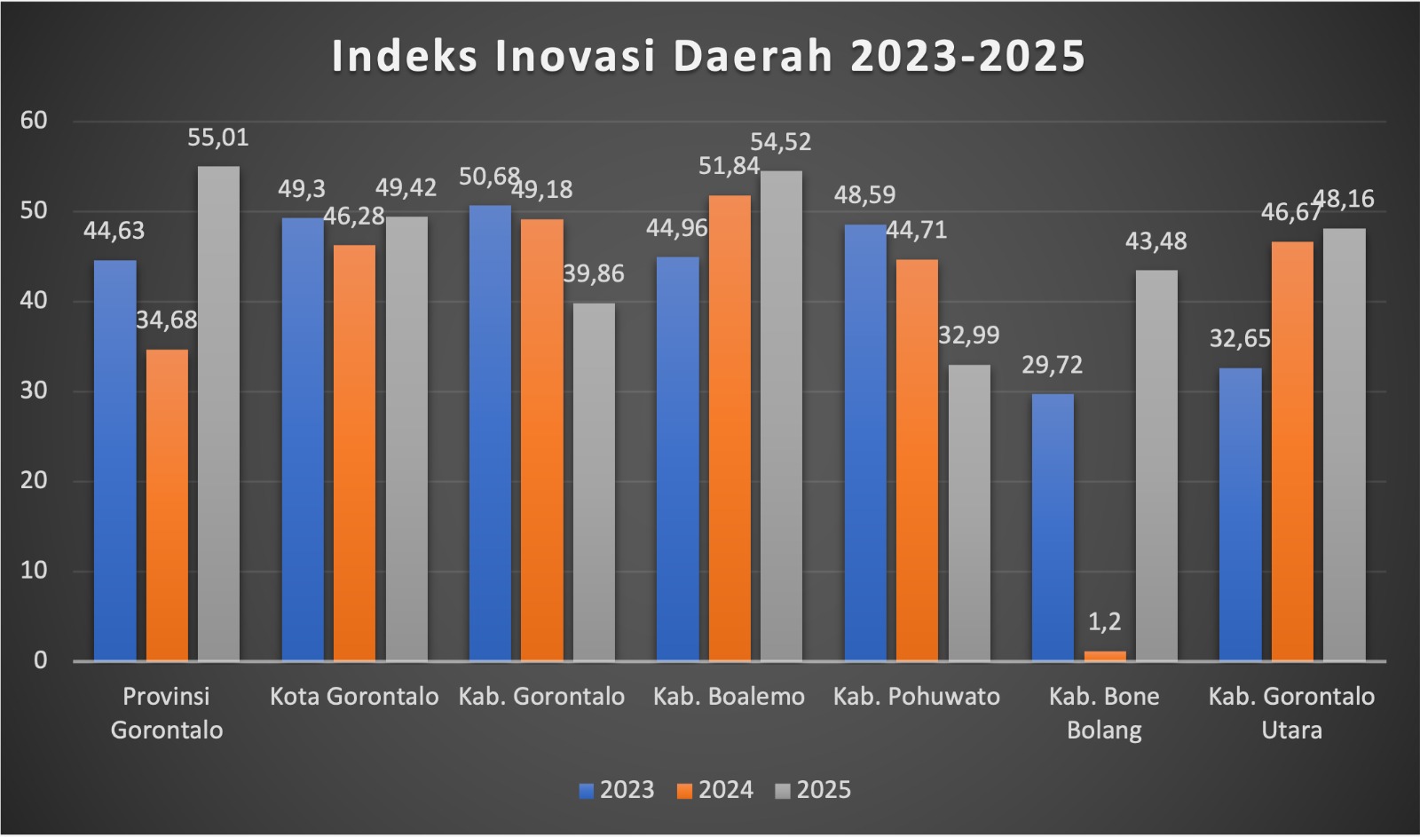 HABARI.ID, PEMPROV | Capain demi capaian kembali ditunjukkan Provinsi Gorontalo. Kali ini Provinsi Gorontalo mencatatkan capaian positif dalam pembangunan inovasi daerah. Berdasarkan Keputusan Menteri Dalam Negeri Nomor 400.10.11 – 6097 Tahun 2025, hasil Indeks Inovasi Daerah (IID) Gorontalo resmi masuk dalam kategori daerah inovatif, setelah pada tahun 2024 masih berada pada kategori kurang inovatif.