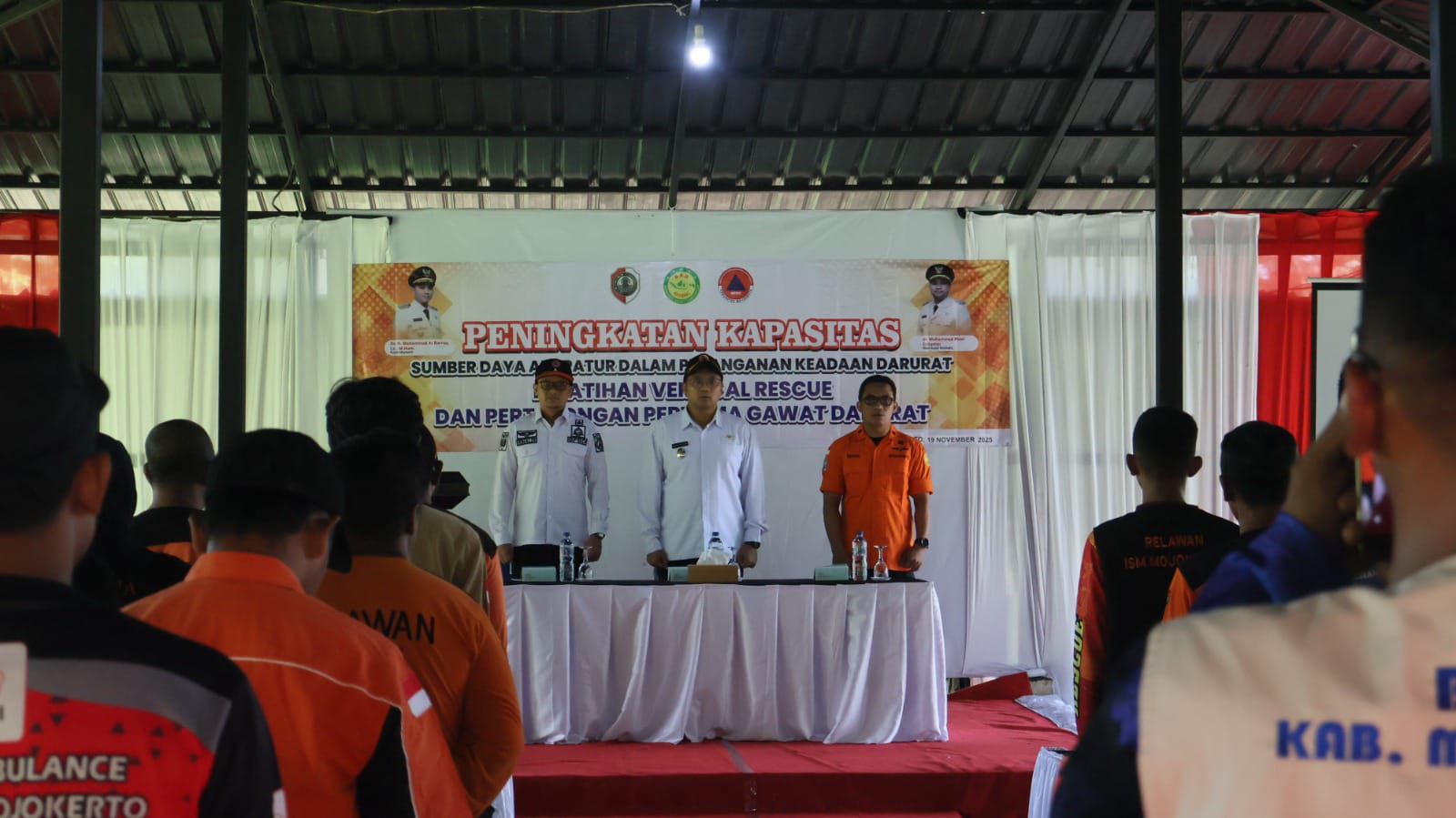 HABARI.ID KABUPATEN MOJOKERTO – Pemerintah Kabupaten (Pemkab) Mojokerto menguatkan komitmen dalam kesiapsiagaan bencana. Hal tersebut dapat diketahui saat Pemkab Mojokerto melalui Badan Penanggulangan Bencana Daerah (BPBD) Kabupaten Mojokerto, menggelar pelatihan Vertical Rescue dan PPGD (Pertolongan Pertama Gawat Darurat), Rabu (19/11) pagi.