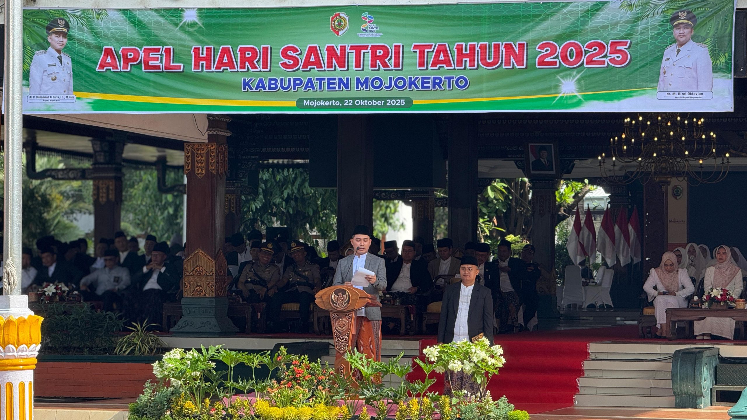 Pemerintah Kabupaten (Pemkab) Mojokerto menggelar Apel Peringatan Hari Santri Nasional (HSN) Tahun 2025 pada Rabu (22/10), bertempat di halaman Kantor Pemkab Mojokerto. Dalam momen tersebut Bupati Mojokerto, Muhammad Albarraa, mendorong para santri menjadi penggerak peradaban, bukan sekadar penyaksi perubahan zaman.